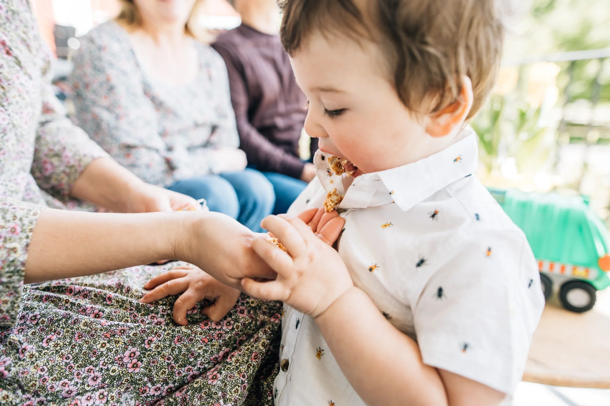 Thad decided he was done with his snack but mom anticipated the moment and saved the beautiful shirt! A good memory in a few years!
